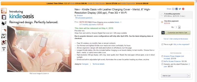 I just accidentally stumbled across a listing for the Kindle Oasis with the highly sought after Merlot cover shipping as soon as May 4th. The configuration available is the 3G plus WiFi model without special offers. Be warned,though – the price tag for the e-reader and cover is a whopping $379.99! Amazon is also offering a payment plan of five monthly payments of $76 to ease the sting. But, hey, if it is the cover color of your dreams, the May 4th delivery date is much more appealing than some of the June, July and even September dates being discussed on the forums.