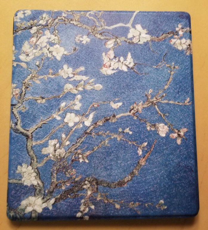 When I pre-ordered my cover, only black was available. Now the cover also comes in indigo blue as well as several designs: an almond blossom, a floral purple, a tree design and a starry night design (based on the Van Gogh painting). I bought a second cover in the almond blossom which has a lovely teal-aqua colored background.