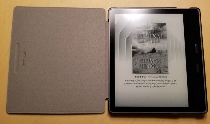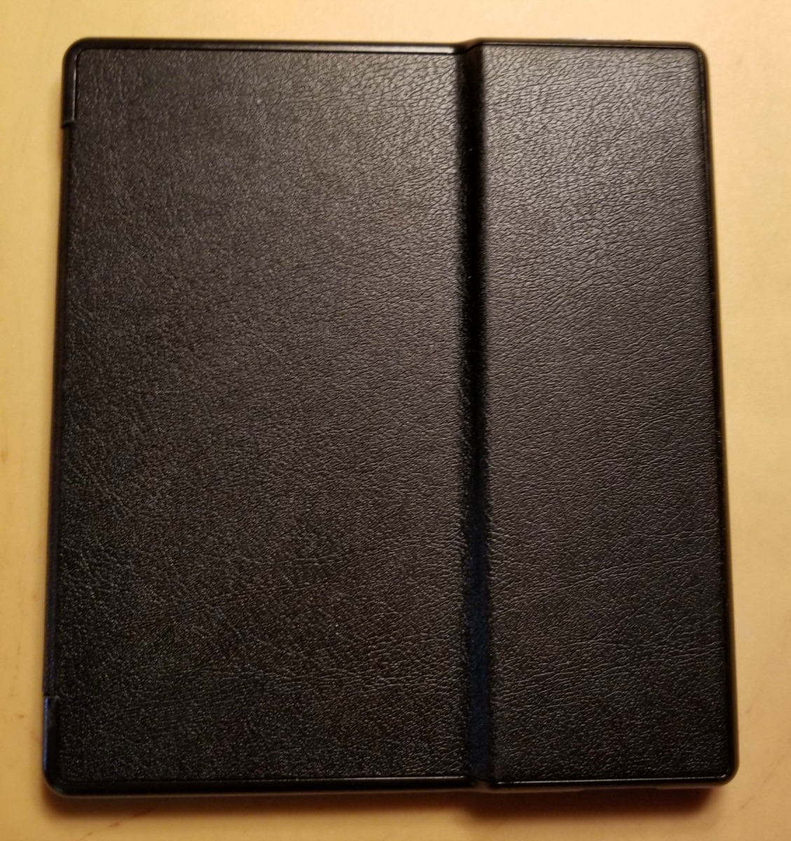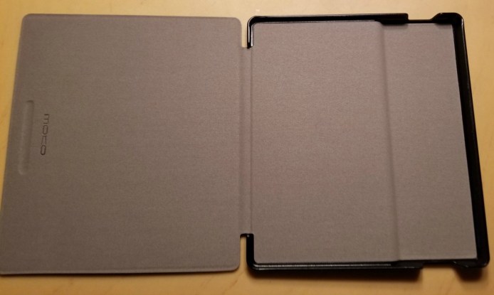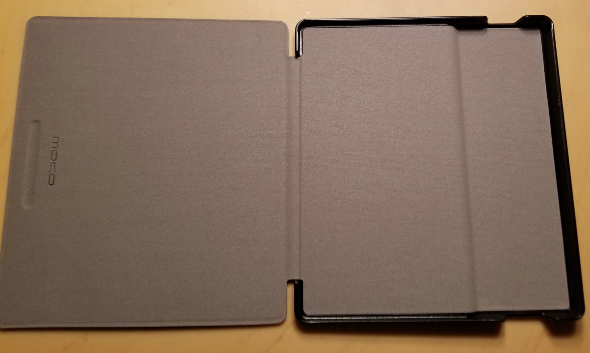 I bought the MoKo Case for All-New Kindle Oasis (9th Generation, 2017 Release) – Premium Ultra Lightweight Shell Cover with Auto Wake / Sleep for Amazon Kindle Oasis E-reader Case in Black. The MoKo case is a plastic clamshell case with a back shaped like that of the Oasis itself. The e-reader snaps into the case, which completely covering the back. The attached front cover has a soft lining to protect the device screen and also features a magnet for the wake/sleep function.