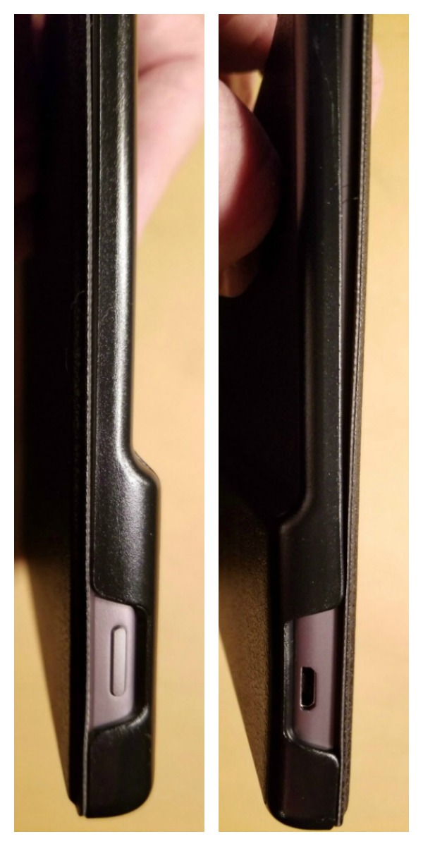 The cutouts for the power button at top (right) and the charging port at the bottom (left):