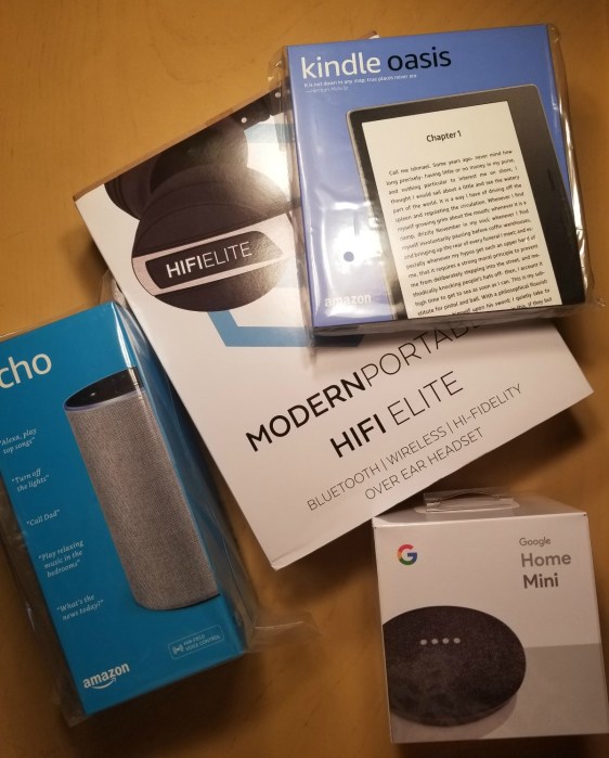 I think a big part of the reason is the so many of the items offered for sale I already have.  I’ve already bought Echos, Echo Shows, Echo Dots, Kindle Paperwhites, a Kindle Oasis, Fire tablets,  Fire TV sticks,  etcetera. The picture in this post is just a few of the items that I already have (yes, there are more that arrived after I took that picture) and am currently testing to review.